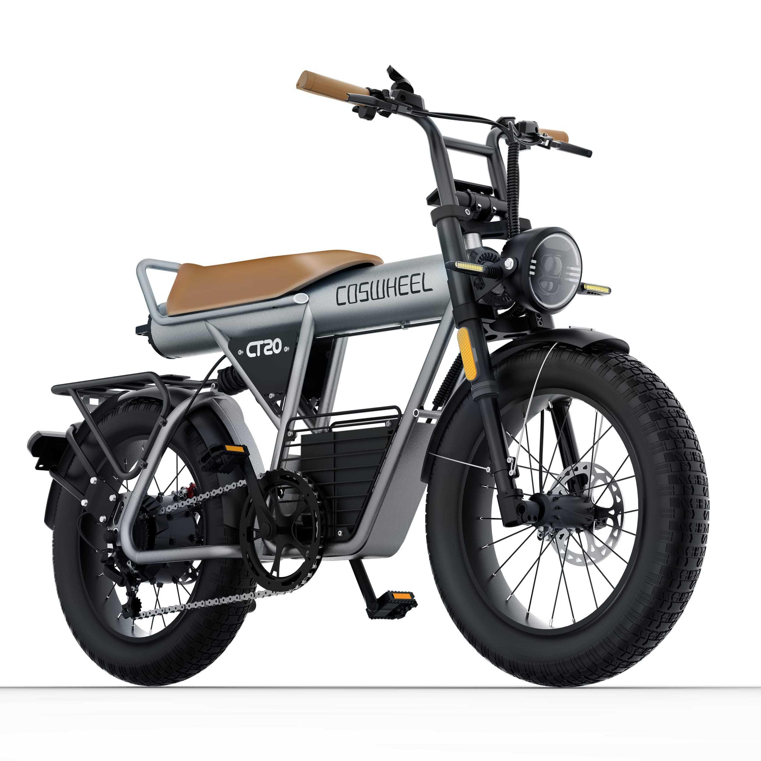 CT20 was designed as a family electric bike for families. Its extra-long frame, standard rear cargo rack, and 20" x 5" all-terrain tires made it ideal for two adults and one child. Initially, the CT20 1.0 featured a 1200W peak power (rated 750W) motor, later upgraded to a 1500W peak power (rated 1000W), a 25AH battery, and a top speed of 28 mph (45 km/h). Following extensive discussions with fans, the CT20 2.0 was released in 2025, featuring upgraded rear suspension, seat, and rear fender.